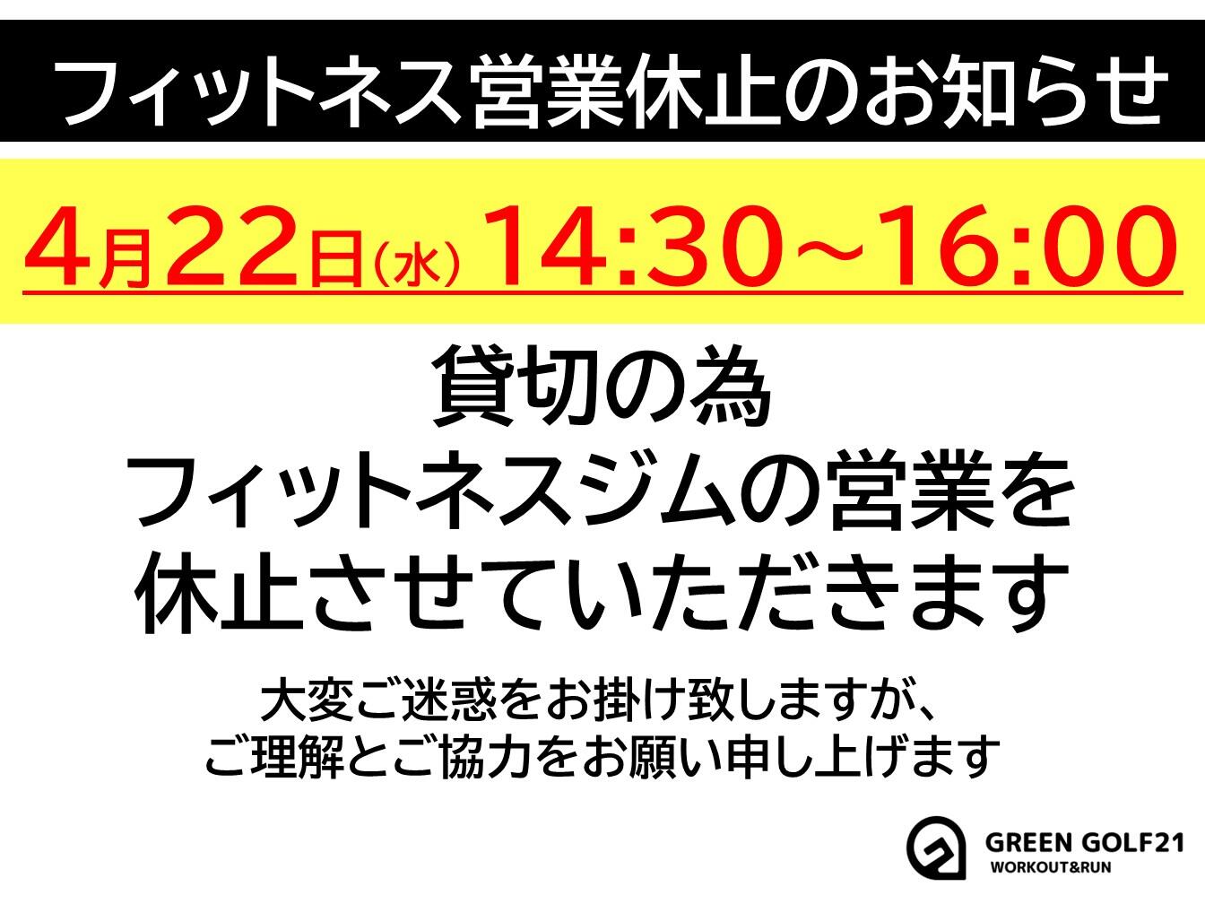 日頃よりグリーンゴルフ21をご利用いただき誠にありがとうございます4月22日(水)は貸し切りのためフィットネスルームの営業を14:30~16:00の間休止とさせていただきます大変、ご迷惑をお掛け致しますがご理解ご協力をお願い申し上げます