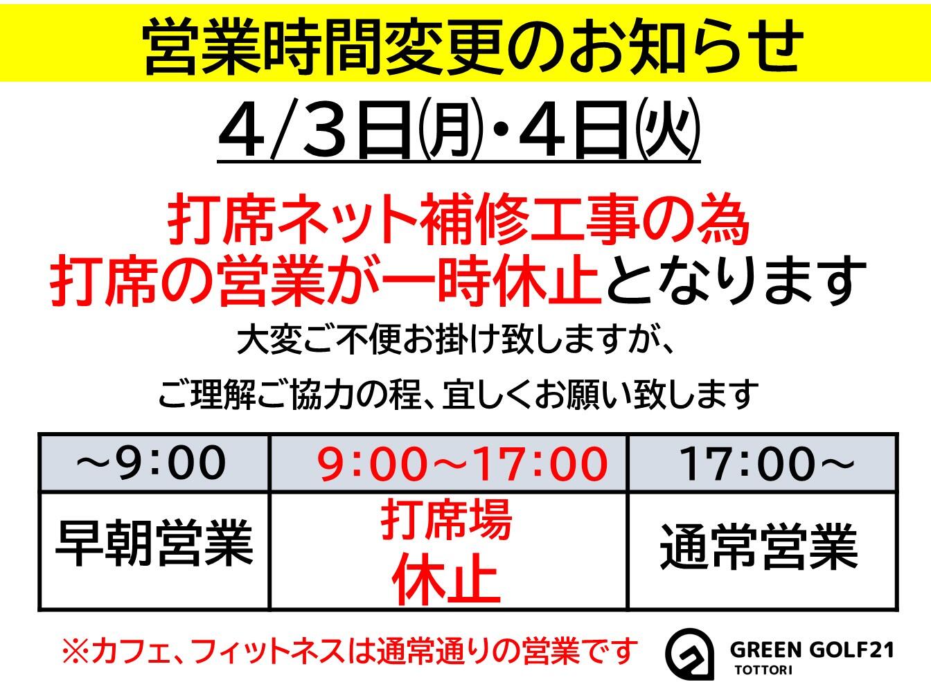 打席ネット補修工事の為打席の営業が一時休止となります