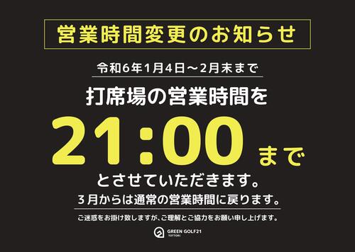 令和6年1月4日(木)から2月末まで打席場の営業時間を21:00までとさせていただきます(深夜営業はありません)